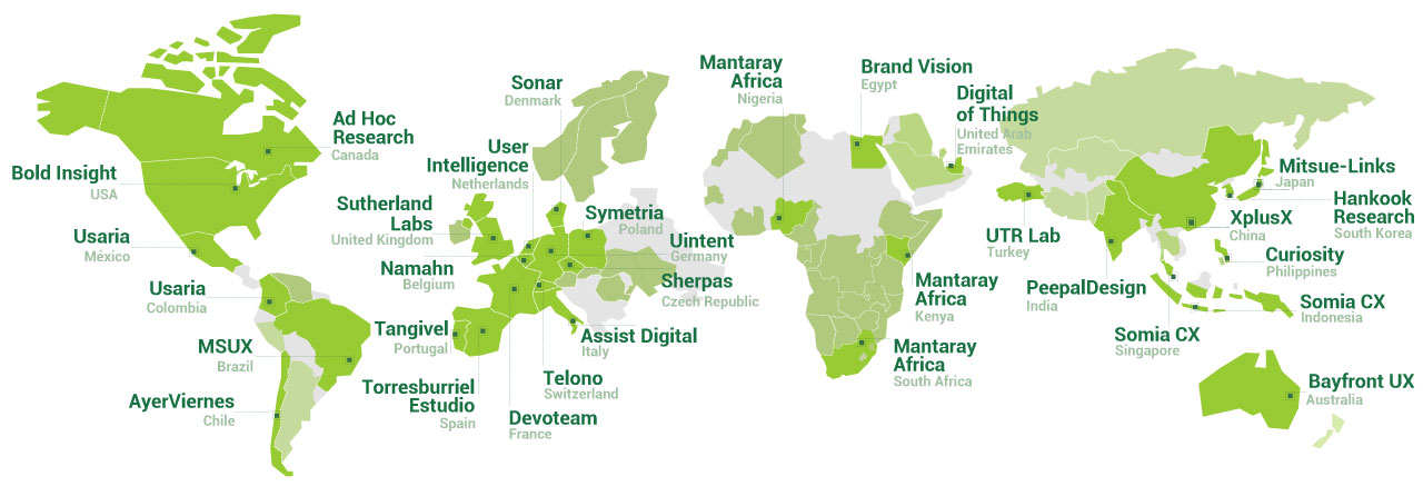 Nuestra creciente red de socios y afiliados nos permite ofrecer capacidades globales de investigación de usuarios a escala. Trabajamos con confianza, colaboración e intercambio de conocimientos para ayudar a nuestros clientes a planificar, diseñar, ejecutar y coordinar sus proyectos globales a través de un único punto de contacto.